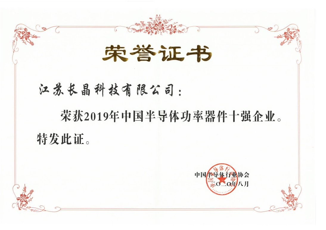 近日,中国半导体行业协会正式发布了“2019年中国十大集成电路设计企业”、“2019年中国十大半导体制造企业”、“2019年中国十大半导体封装测试企业”、“2019年中国半导体功率器件十强企业”、“2019年中国半导体行业MEMS十强企业”、“2019年半导体行业材料十强企业”、“2019年中国半导体设备五强企业”榜单,江苏长晶荣获“2019年中国半导体功率器件十强企业”荣誉称号。